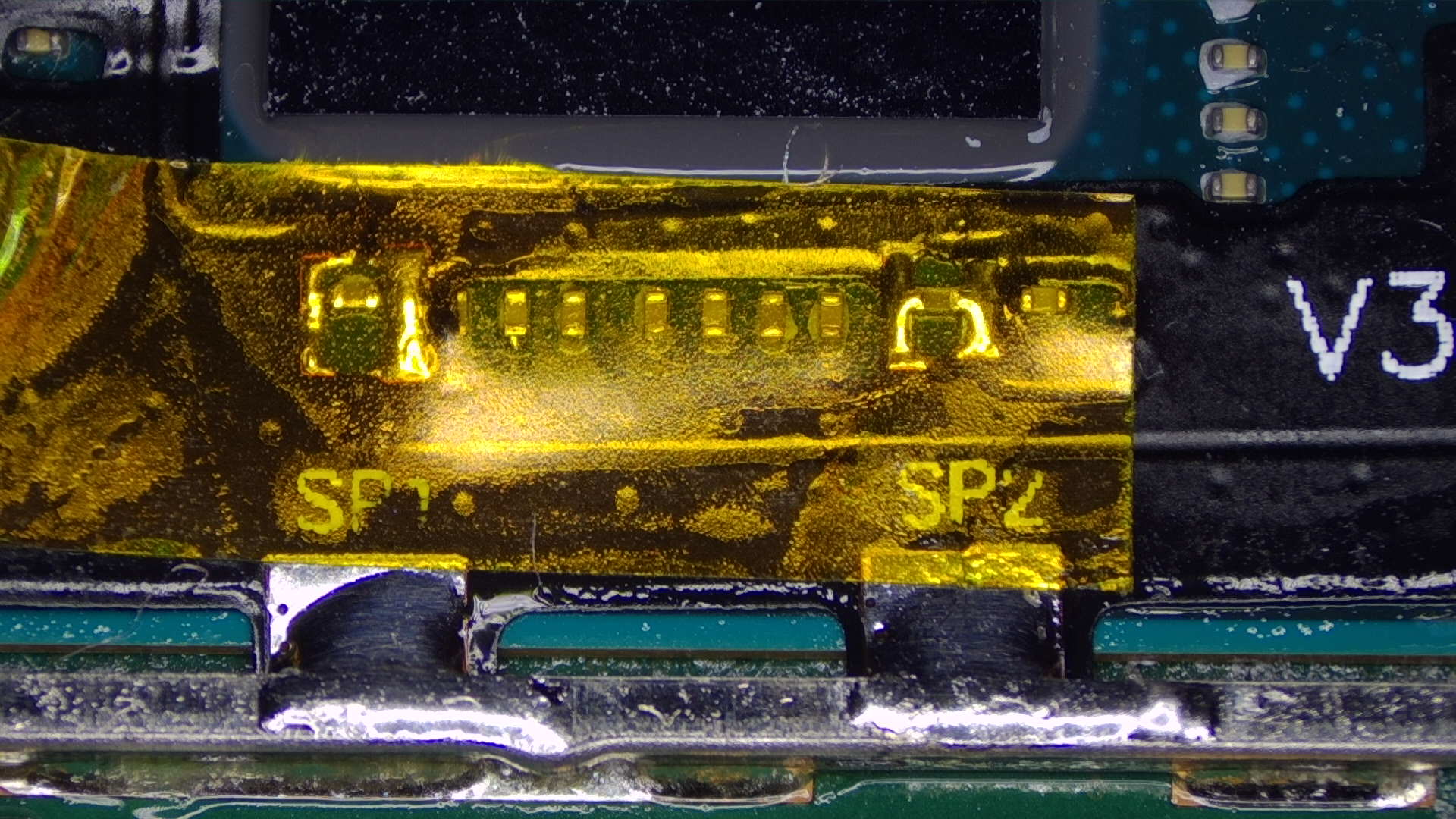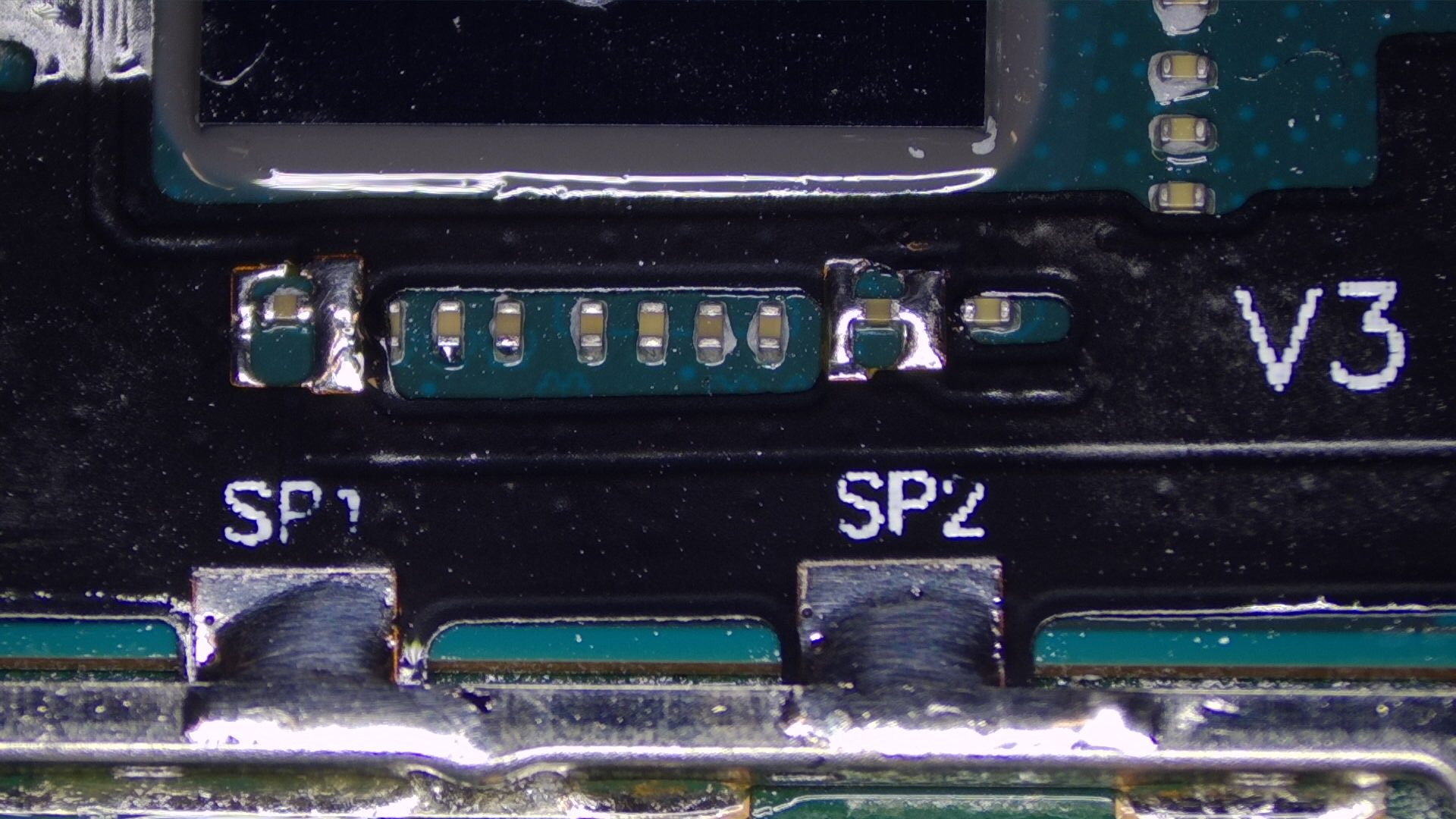 SP1andSP2points, ensure the solder flows between the pad on the ribbon cable and each end of the capacitors.