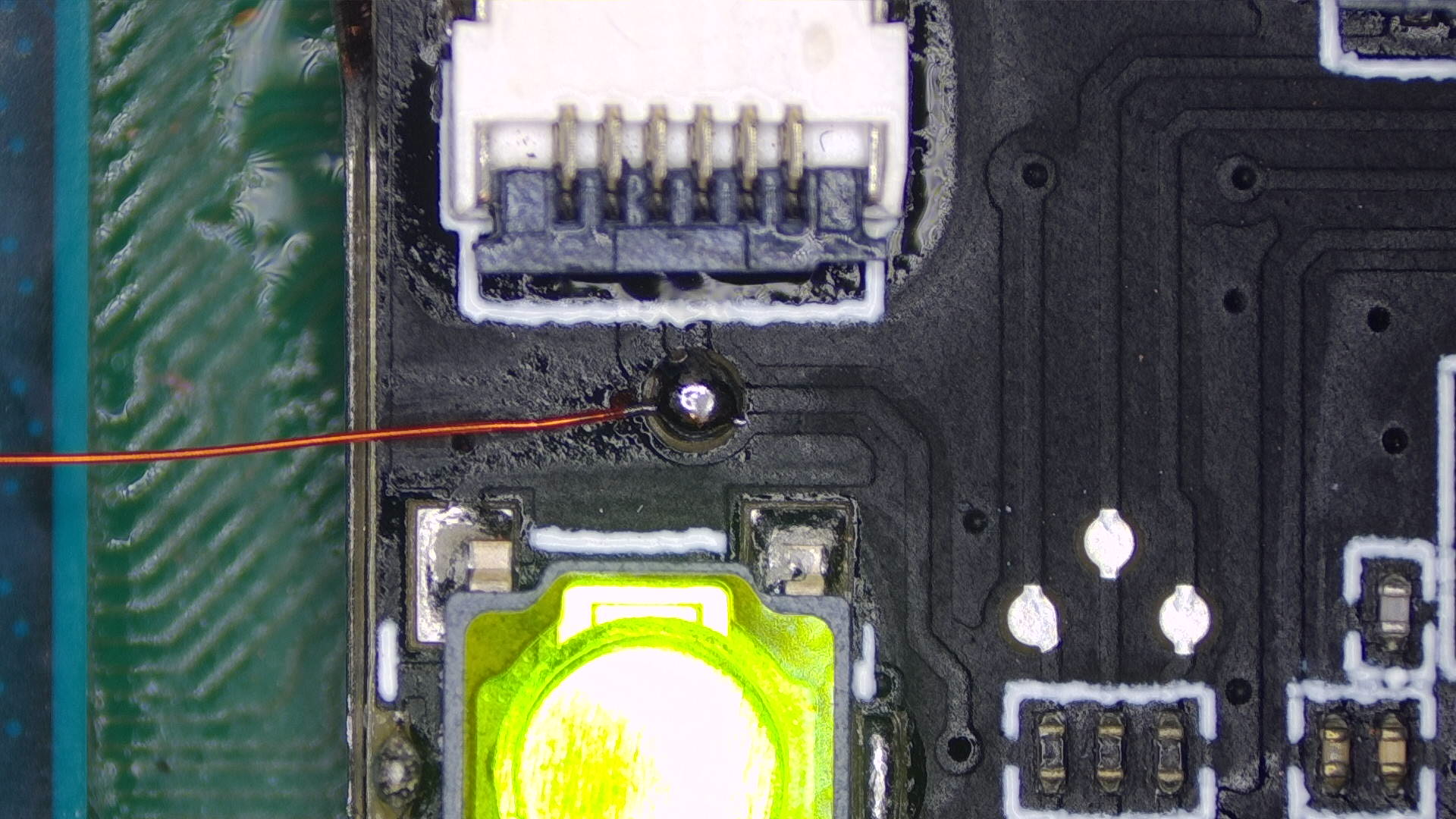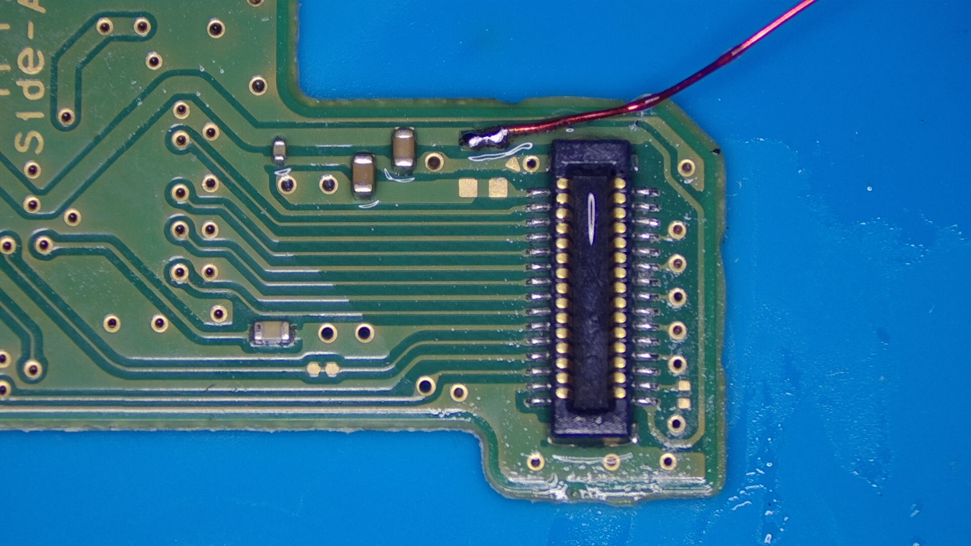 Solder the wires onto each point now. Make sure there's a solid connection between the pads on the board and your wire. I've scraped the solder mask off of the via at the